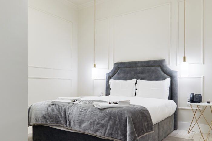 Suite localizada no andar superior do Palacete com varanda. Decoração elegante e luxuosa com detalhes contemporâneos, muito acolhedores. O quarto oferece uma sensação de conforto intemporal para momentos especiais e uma estadia tranquila.